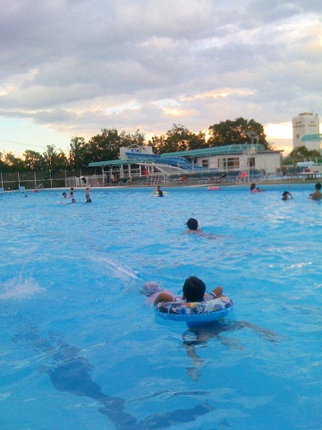 ふとその時、そーや!確か近くに市民プールがあったなー、市民プールでも水に浸かれるなー、そこやったら子供2人連れて行っても大丈夫かなと、チビ達に聞くと「行く、行くー!」(さすが、河童の子は河童)